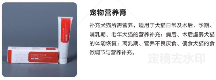 補充犬貓所需營養,適用于犬貓日常及術后、孕期、哺乳期 老年犬貓的營養補充;病后 術后虛弱犬貓的體能恢復;離乳期、營養不良厭食、偏食犬貓的食欲調節與營養補充。